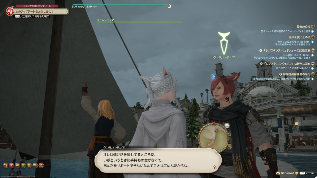 双子、サンクレッドとウリエンジェ(この二人すっかりコンビになったなぁ、サンクレッドも何だか楽しそうで何より)は出てきたけど、あれ…?ヤ・シュトラは…?姿なかったよね🤔あとエスティニアン、ひとりだけ南に行く事選ばなくて良かったね🤭