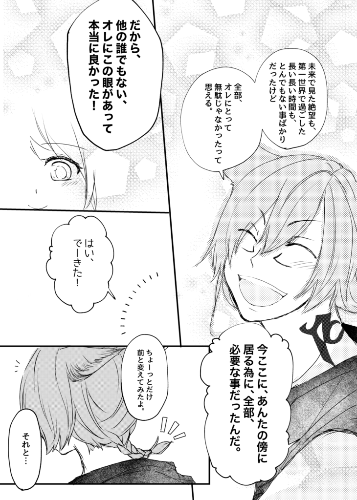 7:それから 2022 8/24 ラハ光♀本編 2022年8月24日 頭割り3展示用に描きました!ラハくん本当に良かったな…って思いでいっぱいです。これからいくらでも冒険に連れて行くからね! sign_language0 拍手送信中です×※コメントは最大500文字、5回まで送信できます送信送信中です送信しました! ラハ光♀本編 グ・ラハ・ティア 光♀