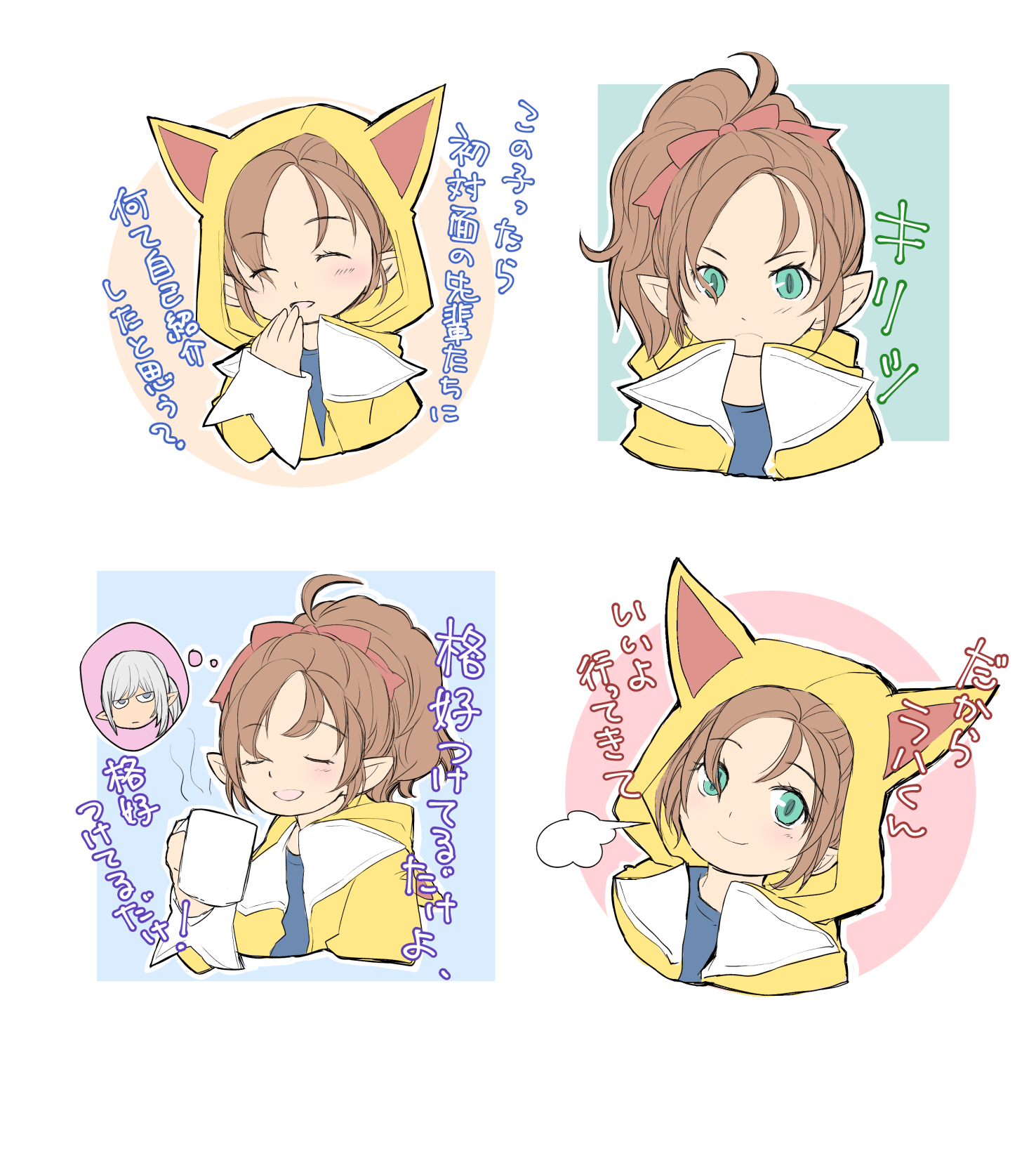 スタンプ風に可愛いの描きたいな、と思っていくつか描いてみました。年上にもお姉さんなクルルさん可愛い〜〜。ちなみに台詞は、左上アルフィノ(まだ会ったばかりの頃)、左下ニャン(6.0ナップルームで皆でご飯食べた時)、右下ラハ(6.1IDに出向く時)のものです。