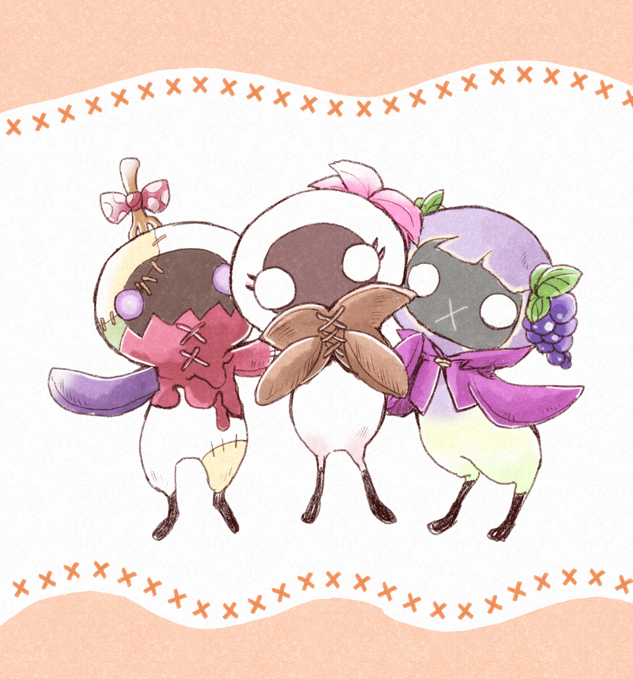 前回のブドウちゃんを描いていたら、ふと描きたくなってしまって(笑)。可愛いが3匹集まったら、アイドルみたいだなぁ…って。あの歌姫たちみたいにね!「正統派クイーン・あざと可愛いブドウちゃん・個性派ピーリフール」みたいな。