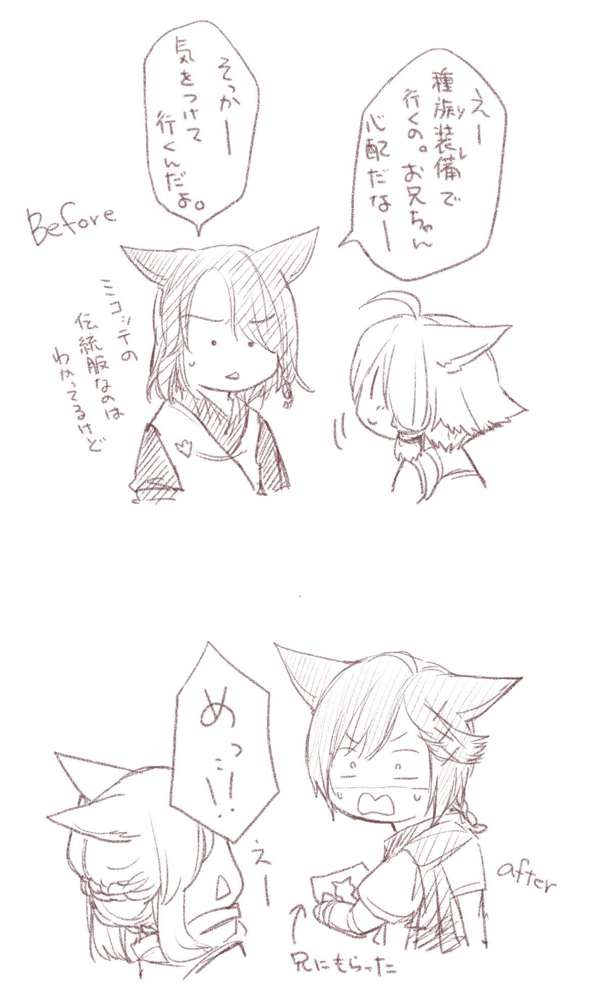きっとミコッテの初期装備で冒険に出た…んだろうなって思ったら、周りの反応も気になりましたwうちのこのお兄ちゃんは、心配しつつも自由にさせてくれそうだし、今のラハ君だったらそんな恰好で街中なんて歩かせてくれなそうwうちのこは、たぶんこれくらいの露出ならあんまり気にしてないですw
